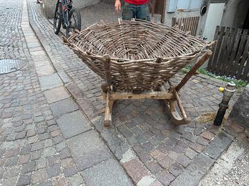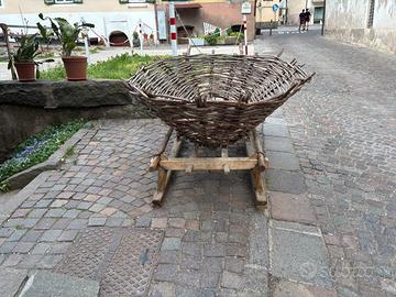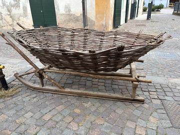Vendo antica slitta per il trasporto di materiale con cesto, ideale per l’arredo di giardini