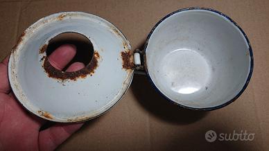 Antica " Sputacchiera" portatile da viaggio inizi '900 in metallo smalto porcellanato diametro cm 11,5 x 6 di altezza. Lotta alla Tubercolosi, lotta Tbc, Giornata delle Due Croci.