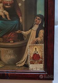 questa antica stampa raffigurante la madonna del rosario di pompei, è stata trovata in una casolare rinascimentale nel Molise, può darsi sia fine 800 primi 900, trovata così in originale con a destra un bellissimo santino raffigurante il bambino Gesù e sulla sinistra un santino con reliquia di "santa gemma Galgani" molto antica e bella anche la cornice in legno. misure 48x38,5