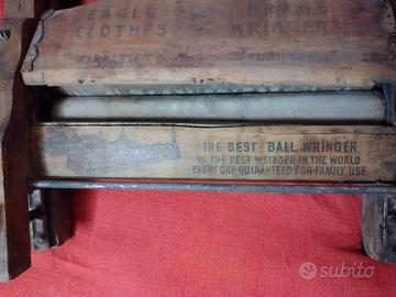 Antica strizzatrice per panni , marca "Eagle Brand", prodotta da Lovell Manufacturing Co., nella contea di Erie, Pennsylvania, U.S.A. tra la fine del 1800 e l'inizio del 1900. Questo tipo di strizzatrice veniva comunemente usato in passato per strizzare l'acqua in eccesso dai vestiti dopo il lavaggio a mano.