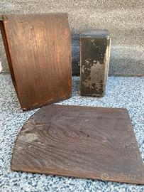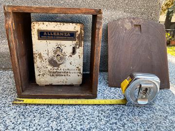Antica sveglia salvadanaio Junghans funzionante ma da revisionare, con il suo box in legno. Evidenti segni di usura nella verniciatura, vetro perfetto e legno da restaurare