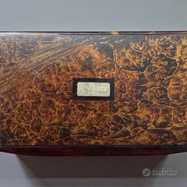 Epoca: prima metà dell’Ottocento (ca. 1820–1850). Provenienza: Francia. Materiale esterno: radica impiallacciata su base lignea. Materiale interno: finta tartaruga ottocentesca. Inserti: intarsi a ventaglio. Cerniera: perno interno rivestito. Dimensioni: 10,2 × 4,5 × h 3 cm. Condizioni: esterno ottimo; interno con distacchi tipici dell’epoca.