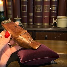 Una scarpa che non ha mai camminato, eppure ha attraversato un secolo e passa. Questa tabacchiera ottocentesca in legno, scolpita a mano a forma di scarpa nord-europea, nasce per restare ferma: su una credenza, su un tavolo, accanto a una pipa o a una finestra. Non è un oggetto da tasca, ma da gesto lento. Da casa. La punta leggermente rialzata, il piccolo tacco, l’intaglio floreale sul puntale raccontano una tradizione domestica precisa, fatta di rituali quotidiani e di attenzione per le cose ben fatte. Lo sportello superiore si apre grazie a un incavo frontale voluto, pensato per il dito: una soluzione antica, intelligente, che rivela quanto questo oggetto fosse progettato per essere usato davvero. La patina del legno è calda, vissuta, mai rifatta. L’ottone della cerniera conserva l’ossidazione naturale del tempo. All’interno, i segni sono quelli discreti del tabacco da fiuto, usato senza fretta, sempre nello stesso luogo. È una scarpa che non porta lontano, ma tiene. Tiene il tabacco, la casa, l’abitudine. E forse anche una storia che non ha mai sentito il bisogno di muoversi.