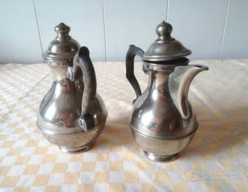 Bellissima antica coppia di teiera caffettiera argentati con manico in legno.