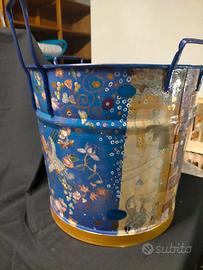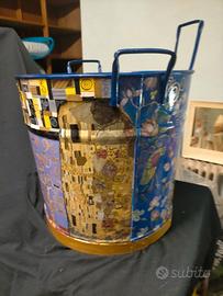 ANTICA TINOZZA CON TRE MANICI DECORATA CON LA TECNICA DEL DECOUPAGE E CON ACRILICI ALTA CM. 40, CON DIAMETRO ALLA BASE CM.35. I SOGGETTI RIPRODOTTI SULLA SUPERFICIE SONO TRATTI DA DIPINTI DI GUSTAV KLIMT . LA TINOZZA PRESENTA UN FORO ALLA BASE CHE IN ORIGINE ERA UNA VALVOLA DI SCOLO DEL LIQUIDO PRESENTE ALL'INTERNO. OGGI È UN OGGETTO DI ARTE DECORATIVA CHE PUÒ DIVENTARE UN PORTAFIORI, UN PORTAOMBRELLI, ECC. PER ABBELLIRE UN AMBIENTE CLASSICO, MODERNO ED ECLETTICO. BELLISSIMO OGGETTO DA USARE, DA COLLEZIONARE O DA REGALARE