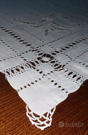 Raffinatissima tovaglia in lino fine '800, inserto centrale in micro filet e disegni stile giglio agli angoli, oltre ai bordi a cornice