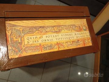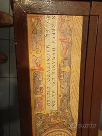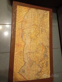 Antica valigia di legno, con dipinte mappe del mondo. Conservata., interno da ricoprire.Misure cm 60 x 37 x 20. Spedizione da concordare