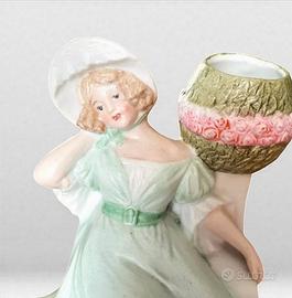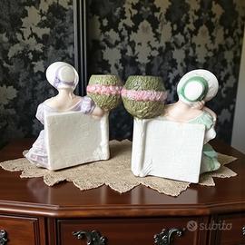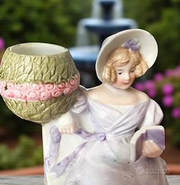 Due giovani dame in abiti pastello, una in verde menta e l’altra in delicato lilla, siedono con grazia come se fossero ritratte in un giardino romantico. Tra le mani custodiscono piccole bouqueteries in ceramica, pensate per accogliere minuscoli fiori freschi o secchi. Realizzate a metà Novecento, in biscuit smaltato opaca dai toni tenui, queste figurine racchiudono il gusto nostalgico delle manifatture europee dell’epoca. Un leggerissimo difetto di lavorazione sul retro (non una crepa) le rende ancora più autentiche, testimoniando la mano artigiana che le ha create (ultima foto: praticamente invisibile). Una coppia armoniosa, ideale per chi ama il décor romantico e i dettagli che sanno raccontare un tempo sospeso. Alte circa cm 11.