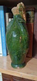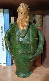Tre rari recipienti antropomorfi in ceramica dipinta e smaltata, utilizzati anche come fiaschette, bottiglie o lucerne. Di tipica produzione artigianale del Sud Italia dell'inizio del Novecento. Dimensioni 25x14 cm. circa, in buono stato con piccole imperfezioni date