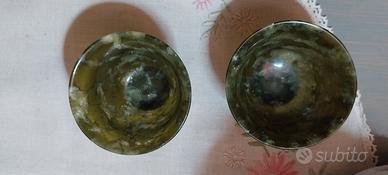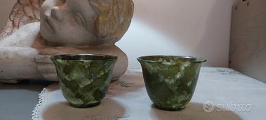Vendo bellissime integre coppia di ciotole scolpite in un unico pezzo di "Giada Spinacio" traslucida di ottima qualità con svariate sfumature di verde e intrigate venature. Abilmente lavorate e vendute all'interno della loro scatola originale. Sono sinonimo di pace interiore e grande saggezza. Immancabili in una collezione. Dimensioni : altezza 4.5cm ø 6cm