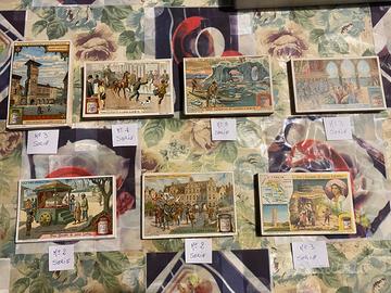 Antiche figurine LIEBIG,n.56 serie complete e n.80 sfuse. e una serie completa da 6 figurine estratto di carne BANDIERA RARISSIMA.n.3 serie complete. VERO FRANCK altrettanto rare,altre foto posso inviarle a richiesta,il sito me ne fa pubblicare solo 6.Cedo solo in blocco. Consegno a Lodi oppure posso spedire.