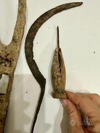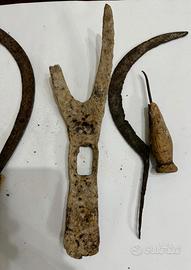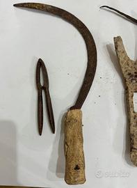 Set formato da 5 antichi attrezzi agricoli e non: 2 falci, parte finale di zappa, 1 punteruolo, 1 schiaccianoci. Normali segni di usura dovuti al tempo