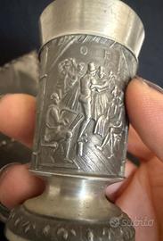 Set formato da 3 antichi bicchieri in peltro: 2 con raffigurazioni intarsiate ed 1, il più grande, con stemma applicato