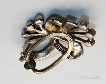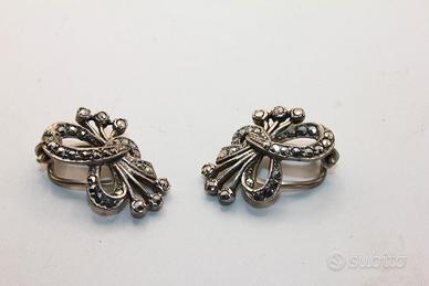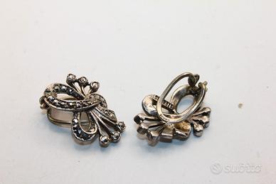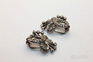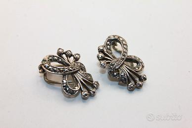 Questi affascinanti orecchini antichi, realizzati in argento e impreziositi da scintillanti marcasite, incarnano un'eleganza d'altri tempi. Con le loro dimensioni contenute di 22 x 15 mm, questi gioielli presentano un raffinato design che ricorda un fiocco o una composizione floreale stilizzata. La montatura in argento fa da sfondo a numerose piccole pietre di marcasite, tagliate e incastonate per catturare la luce e creare un delicato effetto brillante, tipico dei gioielli realizzati tra l'epoca Vittoriana e il periodo Art Déco. La patina del tempo sull'argento potrebbe ulteriormente accentuare il loro carattere storico e il fascino vintage.