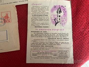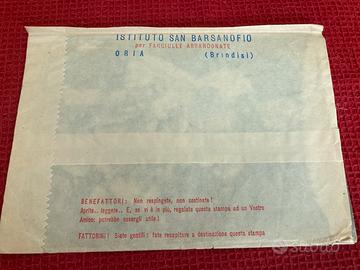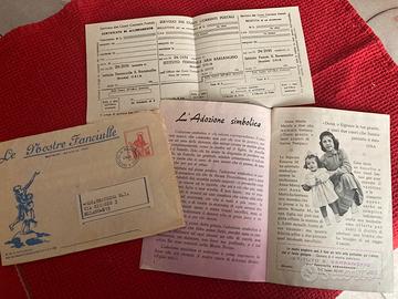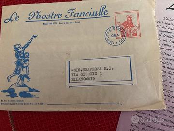 Questa immagine mostra documenti vintage, tra cui una busta e un bollettino postale della rivista per ragazze "Le Nostre Fanciulle". Periodo: I documenti indicano una corrispondenza cartacea risalente al passato.anno 1961 Oggetto: Si tratta di materiale d'epoca legato a una pubblicazione o associazione femminile, dell'Istituto San Barsanofio di Oria. Dettagli: La busta è indirizzata a Milano e il bollettino è relativo al pagamento di una quota o abbonamento