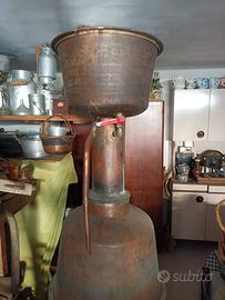 Vendo raro alambicco d’epoca in rame, altezza superiore ai 2 metri, completo di caldaia, colonna, vasca superiore e tubazione laterale.