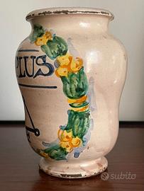 Affascinante albarello antico da farmacia, in ceramica smaltata e dipinta a mano, con iscrizione “AMPIPLUS” e decorazioni floreali policrome in stile rinascimentale.