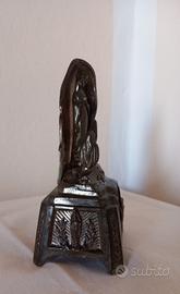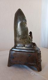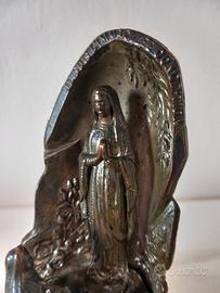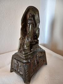 Descrizione: Raro altarino devozionale d'epoca (circa 1920-1940) prodotto dalla storica fonderia francese SERAL - LOURDES. Un pezzo da collezione ricco di dettagli artistici su ogni lato. Fronte: Rappresentazione della Grotta di Massabielle con la Vergine e Santa Bernadette in preghiera. Arco con iscrizione "Je suis l'Immaculée Conception". Base (Fronte): Splendido bassorilievo della Basilica superiore di Lourdes. Lato Sinistro: Raffigurazione della Medaglia Miracolosa tra rami di alloro. Lato Destro: Veduta architettonica delle rampe del Santuario. Materiale: Régule (lega di antimonio) con finitura originale ottonata/bronzea. La patina scura del tempo lascia emergere riflessi dorati nei punti di rilievo. Condizioni: Ottimo stato vintage. Il metallo è stato pulito e protetto con un velo di olio specifico che ne esalta i dettagli e previene l'ossidazione. Dettagli Tecnici: Altezza 15,5 cm. Peso 600 grammi. Fondo cavo con marchio "SERAL" e scritta "LOURDES". Le Figure: La Vergine Maria è l'elemento centrale, raffigurata con le mani giunte e una corona di rose ai piedi (simbolo delle apparizioni). Alla sua destra, in basso, la figura di Santa Bernadette in ginocchio . Tag: #lourdes #antiquariato #seral #oggettisacri #vintage #madonna #regule #collezionismo