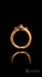 Splendido antico e autentico anello romano in bronzo. La struttura è cava, finemente lavorato a mano in ogni sua parte e monta una perla in corniola autentica sulla cima. Il periodo stimato è circa il IV Secolo d.C. Diametro Interno: 19,3 mm Spessore Fascia: 5x7 mm Peso: 2,87 gr. Periodo: IV Secolo d.C. Condizioni: Buone, solide, indossabili, ripulito. Segni di usura coerenti con l’età e l’utilizzo. Questo tipo di anello era molto comune nell’antica Roma e spesso presentava pietre preziose o lavorazioni come questa. L’anello è decorato con filo applicato e motivi in rilievo, elementi tipici dell’oreficeria romana, ereditati l’arte orafa della granulazione etrusca. La corniola montata, una gemma dal colore rosso aranciato, spesso veniva e viene associata a proprietà magiche e spirituali in diverse culture, già al tempo dei romani. Si riteneva che potesse aiutare a bilanciare il chakra del plesso solare, migliorare la concentrazione e la gioia, oltre a rafforzare il chakra sacrale, amplificando la felicità e la creatività.