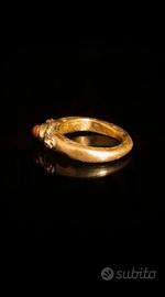 Questo tipo di anello era molto comune nell’antica Roma e spesso presentava pietre preziose o lavorazioni come questa. L’anello è decorato con filo applicato e motivi in rilievo, elementi tipici dell’oreficeria romana, ereditati l’arte orafa della granulazione etrusca. La corniola montata, una gemma dal colore rosso aranciato, spesso veniva e viene associata a proprietà magiche e spirituali in diverse culture, già al tempo dei romani.