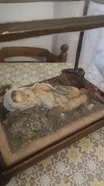 Antico Bambinello in non buone condizioni . Manca un braccio,un piede,e la testa ha subito dei danni. La teca presenta vetri mancanti e rotture. Condizioni come da foto. Solo ritiro in zona.