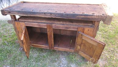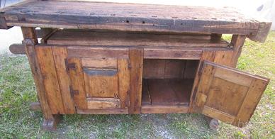 Antico banco appartenuto ad un Maestro del legno, modificato dallo stesso durante l’attività per ottimizzarlo alle proprie esigenze. Oltre ad un robusto piano di lavoro il banco ha due antine in legno che nascondono un generoso spazio dove il maestro custodiva gelosamente i propri attrezzi da lavoro. Tra questo spazio chiuso ed il piano di lavoro c’è un altro piano a giorno che serviva ad appoggiare alcuni attrezzi durante la lavorazione mantenendo il piano principale sgombro. Oggi viene proposto come elemento d’arredo destinato alla persona dotata di grande sensibilità d’animo disposta a farlo rivivere nel proprio ambiente per essere tramandato alle generazioni future. Il banco misura cm 163 di lunghezza x 61 di profondità e cm 83 di altezza. Posso valutare, qualora fosse necessario, la consegna diretta al puro costo del rimborso spese.