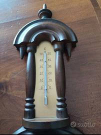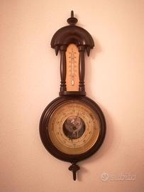 Antico barometro con termometro in legno, vetro e ottone. Misure 47 x 18 cm. Diametro vetro 13 cm. Perfettamente funzionante.