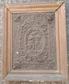 Dama e cavaliere. Bassorilievo in metallo con cornice in legno. Misure circa 20 per 30 cm.
