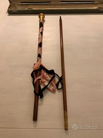 Antico e rato Bastone/Mazza da parata/sfilata, in legno, pomello e puntale in metallo dorato, con tessuto in seta e fiocchi originali dall'epoca, contenuto nel suo astuccio originale in tessuto verde, all'interno impresso in tessuto dorato il nome della ditta produttrice "Ditta Giovanni Gilardini" con sede a Milano, Roma, Torino, Firenze, Napoli.