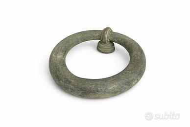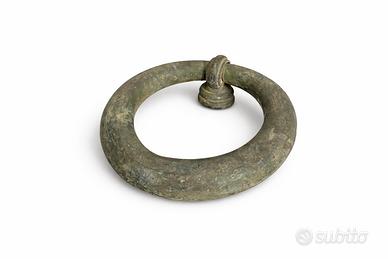 Splendido battente antico da portone in bronzo (o ottone massiccio), con elegante forma ad anello e bellissima patina verde naturale.