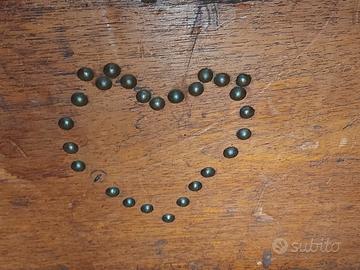 Disegno a cuore sul davanti fatto fa borchie metalliche, come le iniziali A P sul coperchio.