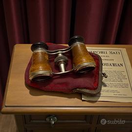 Binocolo da opera d’epoca. Metallo argentato. Rivestimento in cuoio naturale. Oculari in ebanite. Regolazione centrale a vite. Custodia originale in tessuto con montatura metallica. Epoca: fine ‘800 – inizi ‘900. Condizioni: buone, con patina autentica.