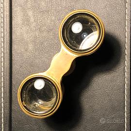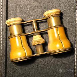 Antico binocolo da teatro fine Ottocento, risalente probabilmente al tardo Ottocento. Questi binocoli, noti anche come "occhiali da opera", erano accessori di lusso popolari durante l'epoca vittoriana e la Belle Époque. Il corpo principale è in ottone, mentre gli oculari e la rotella di messa a fuoco sembrano essere in avorio o un materiale simile. Mostra segni di invecchiamento come crepe e ingiallimento. Design classico e compatto, con un meccanismo di messa a fuoco centrale azionato da una rotella zigrinata. Sono considerati oggetti da collezione vintage e d'antiquariato