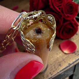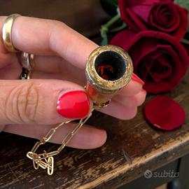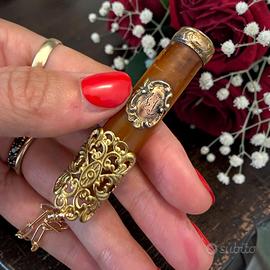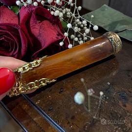 Non è il fumo a restare. È il gesto. C’è qualcosa di estremamente preciso nel modo in cui veniva portato alle labbra: lento, misurato, quasi teatrale. Questo bocchino non nasce per necessità, ma per stile. Per distanza. Per presenza. Realizzato in materia naturale (corno) con quella tonalità calda e viva che cambia leggermente alla luce, conserva tutta la profondità materica degli oggetti organici: non è mai identico a sé stesso, e proprio per questo non è replicabile. Le montature in metallo dorato, lavorate con motivi floreali e sinuosi, incorniciano la forma senza appesantirla. Non dominano: accompagnano. Come un dettaglio pensato per essere notato solo da chi sa guardare davvero. Al centro, una piccola placchetta con monogramma inciso. Non decorazione, ma firma. Qualcuno lo ha scelto, lo ha reso proprio, lo ha portato con sé. Una donna. All’interno, il tempo ha lasciato una traccia discreta. Non disturba. Anzi, conferma. Questo non è un oggetto da esporre soltanto. È un oggetto che suggerisce un modo di stare al mondo. E a guardarlo bene, viene spontaneo chiedersi: chi lo teneva tra le dita… e in quale momento preciso della giornata lo faceva? E cosa ha provato quando successivamente lo ha trasformato in gioiello con l’applicazione della catenella? * Oggetto: bocchino per sigaretta * Epoca: fine ‘800 – primi ‘900 * Materiale corpo: corno prob. * Materiale montature: metallo dorato * Dettagli: placchetta centrale con monogramma inciso * Condizioni: buone, con segni coerenti con l’epoca e uso interno visibile * Catena: presente (successiva o adattata)