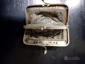 Antico porta monete Epoca fine 1800 in arte Deco “borsellino Châtelaine” rete stile Francese in storica maglia metallica a 3 scompartimenti inciso e placato argento con pendenti.
