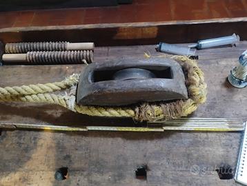 Bellissimo e vecchissimo bozzello in rovere,e gancio in corda mis legno h30 l15. Spesso 10 corda 50 cm