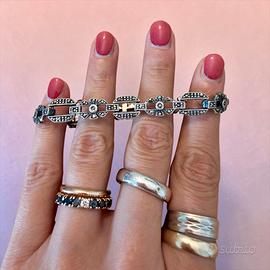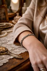 Non è una questione di luce. È una questione di struttura. Questo bracciale si riconosce da come è costruito: maglie allungate, tese, quasi architettoniche. Ogni elemento tiene il successivo con una precisione che non lascia spazio al caso. Le marcasiti non sono protagoniste. Seguono il disegno, lo accompagnano, segnano i punti chiave come piccoli accenti. Ma è la linea, il ritmo, la geometria a fare il resto. Ha qualcosa di deciso, quasi rigoroso. Non morbido, non romantico. Piuttosto essenziale, pulito. Un’eleganza che non cerca di piacere a tutti. In argento, con quella presenza silenziosa che si percepisce prima ancora di guardarlo davvero. Arriva con il suo scrigno blu, da un’altra epoca, completo di caramella di sicurezza. 📏 Lunghezza: 18 cm ⚪ Argento (testato) 💎 Marcasiti 📦 Completo di scatola