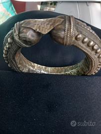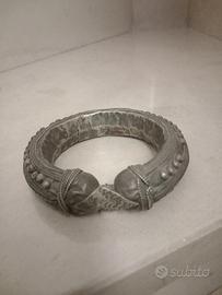 Antico bracciale etnico tribale proveniente dallo Yemen in metallo bianco o argentato , granulato a canna vuota buono stato piccole imperfezione legate all'antichità dell'oggetto. Diametro interno 6,5 cm , diametro esterno 10 cm. Peso circa 85 gr