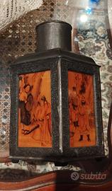 Antico caddy da tè cinese di epoca tardo Qing (fine '800 / primi '900), splendido esemplare di artigianato d'esportazione proveniente dalla celebre zona di Chaozhou. L'oggetto, a rara pianta pentagonale, è realizzato in peltro massiccio molto pesante e presenta cinque pannelli decorati con pitture d'epoca su vetro che ritraggono figure della tradizione classica. La struttura metallica è interamente lavorata a sbalzo con motivi floreali e geometrici. Sul fondo è presente il sigillo originale che garantisce l'autenticità del materiale ("Puro Stagno") e la provenienza dalla bottega artigiana. Un vero "hidden gem" per collezionisti di antiquariato orientale o amanti dell'architettura degli oggetti d'epoca. Dimensioni: altezza 18 cm, larghezza 11 cm.