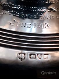 antico calamaio inglese in argento sterling 925 massiccio in stile capstan, prodotto a Chester nel 1916, un classico pezzo di antiquariato inglese da scrivania. Questo modello specifico è caratterizzato da una forma circolare che ricorda l'argano di una nave (capstan), con un coperchio a cerniera e bordi decorati con motivi a linee concentriche. L'oggetto venne donato dai membri della Conservative Association, come da iscrizione a Sir Walter Evans membro del Staffordshire County Council per i suoi meriti. Peso 294 gr, diametro base 14,5 cm