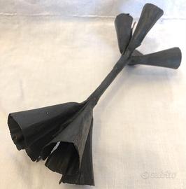 Campanello in ferro battuto artigianale (irregolare) formato da 8 campanelle e un manico centrale, usato in Africa/Haiti per riti tribali. Lunghezza circa 25cm. Le condizioni sono come da foto; le foto sono parte integrante della descrizione dell'oggetto.