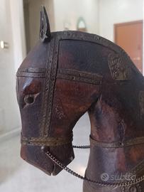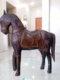 La statua del cavallo è un prezioso esempio di artigianato indiano grande di dimensioni altezza fino alla punta delle orecchie cm 40 lunghezza tra muso e coda cm 36, la scultura è realizzata in legno massello molto pesante con decorazioni bardature in rame e ottone, lievissimi segni del tempo su una zampa e sulla coda ma che non pregiudicano assolutamente la robustezza e la stabilità.