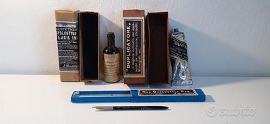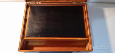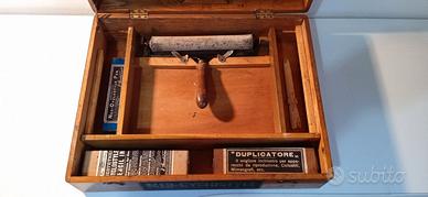 Tardo periodo vittoriano tra 1881 e 1890. Questa macchina da stampa e dispositivo di duplicazione manuale era utilizzato per creare copie prima dell'avvento delle fotocopiatrici moderne. La società fu fondata a Londra nel 1891 dall’ungherese David Gestetner. Pare che David lavorasse alla Borsa di Vienna e New York e fosse stanco di copiare più volte gli stessi dati su diversi fogli, di conseguenza inventò e brevettò la Neo-Cyclostyle. Contenuto: Una carpetta in cartone che presenta (fronte e retro) l’etichetta del produttore e il numero di serie. All’interno della carpetta: fogli di carta stencil originale Gestetner. Una bottiglietta d’inchiostro liquido con custodia, originale Gestetner. Un tubo d’inchiostro in pasta con custodia. La penna per incisione a rullino con custodia, originale Gestetner. Uno spalma inchiostro in bachelite decorata. Una lavagnetta removibile in legno utilizzata per la scrittura degli stencil. Un rullo stendi inchiostro originale Gestetner. Un delizioso libretto d’istruzioni rilegato e scritto a mano in bellissima calligrafia stilografica (presumibilmente opera delle monache del convento nel quale Neo-Cyclostyle è stato recuperato). Il tutto è contenuto in una bellissima custodia in quercia con patina del tempo: dimensioni 47 x 37 x 13 cm. Cenni sul funzionamento: La penna porta in punta un piccolo rullino che incide parzialmente la carta stencil su cui si scrive, indebolendone la struttura e rendendola permeabile all’inchiostro. Questa matrice viene poi fissata nella cornice di legno inclinabile e sulla lastra sotto è posto il foglio sul quale stampare. Abbassata la matrice incorniciata sul foglio bianco, viene steso l’inchiostro tramite il rullo. Così la scritta permeabile trasferisce l’inchiostro dalla matrice al foglio. Il rullo stendi inchiostro presenta i difetti visibili dalle foto. Ottime condizioni come da foto. Non ho provato a stampare quindi si vende come non verificato (anche se sono confidente che funzionerebbe ancora).