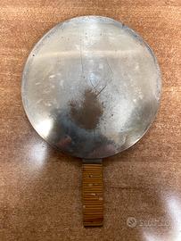 Specchio a mano in metallo (forse rame, ottone, bronzo) databile antecedente 1900, usato con difetti del tempo trascorso, come da fotografie allegate.
