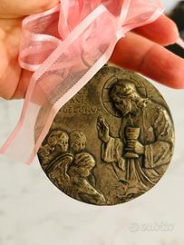 medaglione sacro in bronzo antico (anni 50) in ricordo della Prima Comunione.