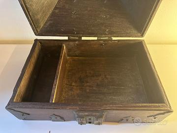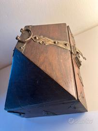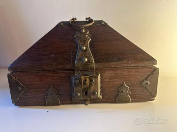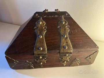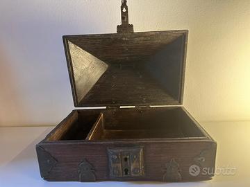 Amadapetti o Nettoor Petti è il portagioie tradizionale del Kerala. Coloro che non avevano altri ornamenti erano soliti usare queste monete d'oro chiamate amada come ornamenti legandole a una corda. Così la scatola della capra, che era una scatola per monete, divenne una scatola di ornamenti. Più tardi, quando la moneta entrò in circolazione, questa scatola fu usata solo per conservare i gioielli. Così un tale portagioie prese il nome di “Scatola della capra”. Amada Petti è il portagioie etnico del Kerala. Le donne del Kerala erano solite conservare gli ornamenti in Amadapetti. Questo è di inizio XX secolo, in legno di noce e borchiature in metallo artigianale. Un bellissimo oggetto d’arredo o da regalo, perfettamente conservato, con segni minimi, come da foto. Misure: 30 x 20 x H.20 cm