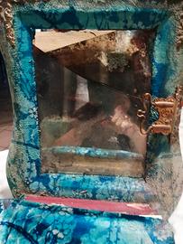 Cofanetto porta foto fine 800, larg cm. 28,lung. 39 cm. Rivestito in velluto e nella parte posteriore in cartoncino, molto rovinato. All interno oltre ai fogli per inserire le foto, è presente uno specchio spezzato e al lato un gancio di metallo che chiude il cofanetto.