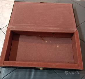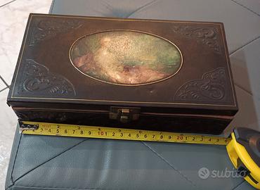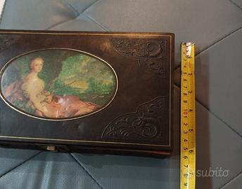 Elegante cofanetto antico rivestito in pelle, impreziosito da un'immagine decorativa.