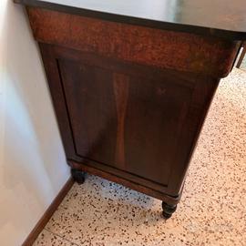 Il fronte è caratterizzato da due Ampi cassetti principali a toppa disposti con venatura del legno in modo simmetrico nel sopra è presente un basso cassetto a scomparsa completamente lastronato; montanti a quarto di cerchio e fianchi bugnati. Gambi a cipolla allungata.