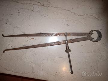 antico compasso a molla (o compasso da forgiatura). Utilizzato per misurare diametri esterni o distanze tra due punti. Le punte ricurve verso l'interno sono progettate per aggirare l'esterno di un oggetto.La molla e la vite di regolazione mantengono fissa l'apertura per una misurazione accurata.